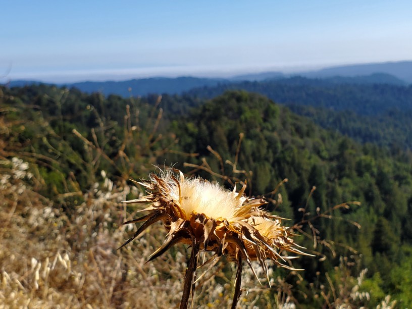 Concluída a subida, surge a paisagem de um vale esplêndido. O esforço valeu a pena e estou com alma leve. Lembro de uma canção budista cujo poema foi escrito na China há mais de mil anos – O Templo de Hanshan. Bem à minha frente estão flores com ar de ressecadas e arbustos desidratados. Se estender o olhar enxergarei apenas as montanhas de Santa Cruz, um mar de pinheiros a se perder no horizonte. Levanto os olhos para a beleza arrebatadora das silhuetas verde-azuladas ondulando à distância, mas escolho também manter no campo de visão a pequena flor amarela. A vida é plural e sua riqueza me comove. A canção se ergue em mim:
