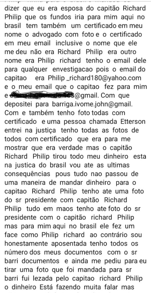 Ana Luiza fez o depósito inicial, mas o golpista pediu mais 600 dólares, alegando que era para seu advogado liberar os U$ 8,5 milhões. A aposentada acreditou que o dinheiro seria depositado na conta dela e com ele compraria uma casa para viver com o militar americano. Sua carta ao presidente dos EUA (leia o print ao fim deste texto) atesta sua inocência e desamparo: “Tenho as fotos de todos os certificados (…) o capitão Richard Philip tirou todo meu dinheiro (…) Vou até as últimas consequências, pois tudo não passou de uma maneira de mandar dinheiro para o capitão Richard Philip. Tenho até uma foto do Sr. presidente com o capitão Richard Philip (…) sou honestamente aposentada, tenho todos os números dos meus documentos enviados (…) só queria comunicar, Sr. presidente, que há justiça aqui no Brasil (…) Como um presidente permite expor sua imagem com o capitão Richard?”.