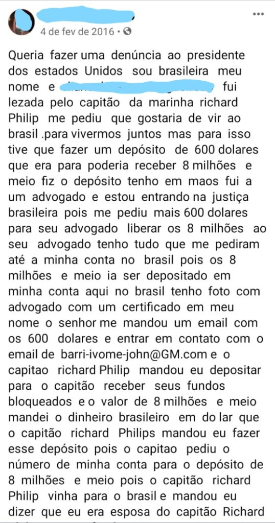 No caso de Ana, a postagem dela explica o que ocorreu. “Queria fazer uma denúncia ao presidente dos Estados Unidos. Sou brasileira e fui lesada pelo capitão da Marinha Richard Philip. Ele me disse que gostaria de vir ao Brasil para vivermos juntos, mas para isso tive que fazer um depósito de 600 dólares que era para ele receber 8 milhões e meio”.