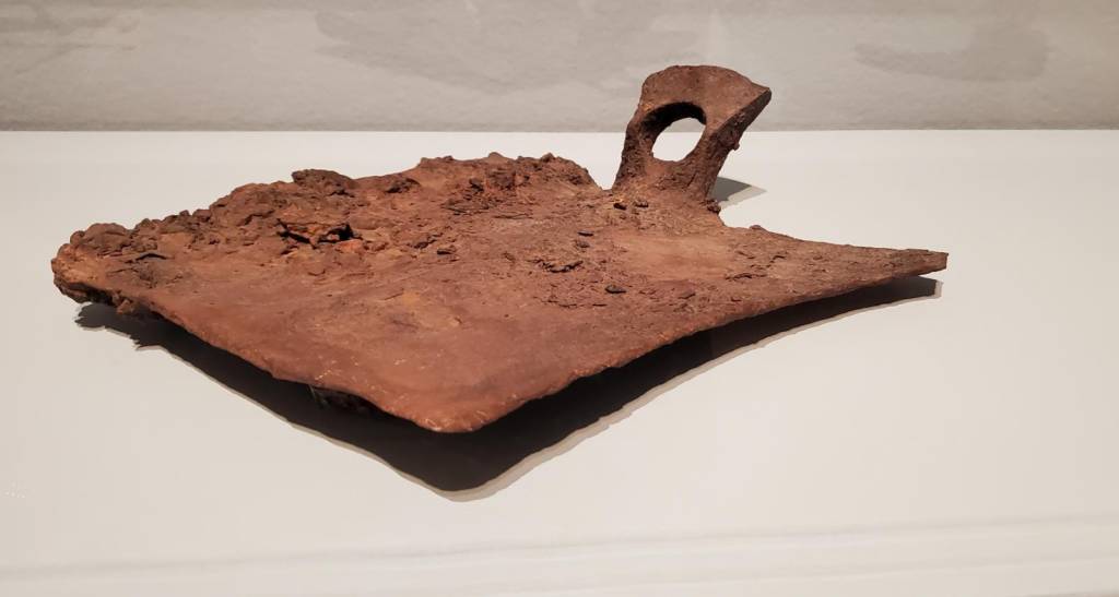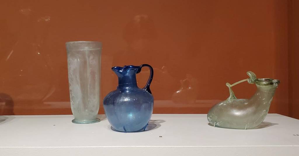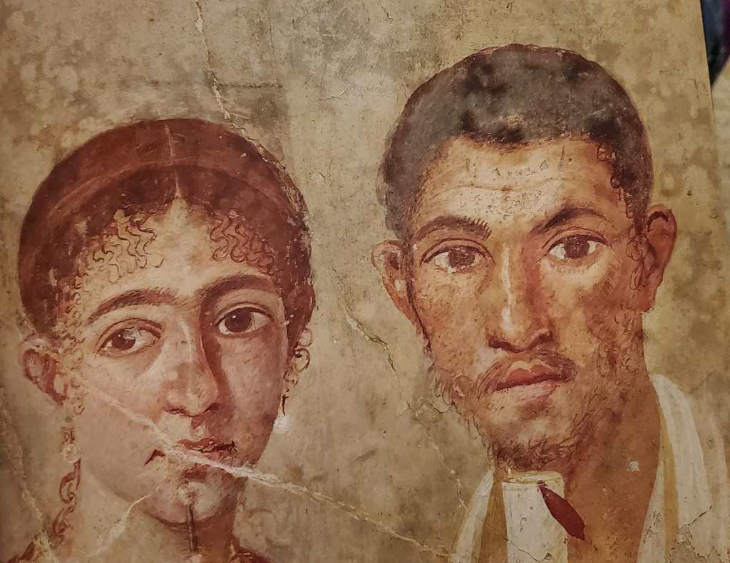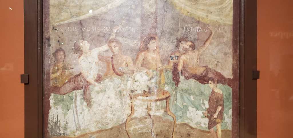 Todos esses rituais de prazer estavam presentes nos detalhes que vi. Grupos de homens e mulheres reclinados em tricliniuns, bebendo as doçuras. Rostos sorridentes, copos cheios, belos corpos. Eternizados pela arte, atravessarão os séculos servindo-se de alimentos – lentilhas, grão de bico, feijão, frutas – em pratos de bela cerâmica. Numa redoma de vidro, descansava um pão enegrecido. Milenar pão, cujo formato caprichado me comoveu. Ao lado dele, jarras de vidro, potes de geleia, grelhas, forminhas de mini bolos e travessas parecidas com as que encontramos em qualquer loja do mundo. O mesmo percebi nos equipamentos agrícolas. Foices, ancinhos, enxadas tão iguais.