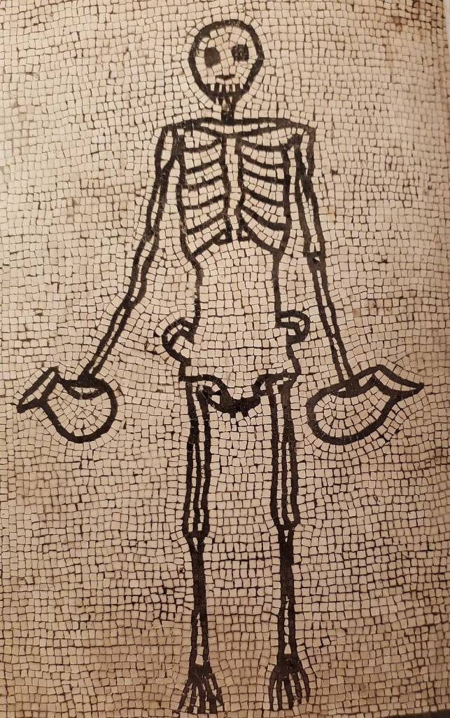Penso na dama de Oplontis: que significaria o cordão barato? Presente dos pais já mortos? De um amante? de um filho? Por que o trouxe junto com o ouro? Viveu tudo o que desejava? Arrependeu-se de algo no último instante? Enquanto rememoro Horácio e sua poesia sobre o desfrutar dos dias até a finitude percebo, diante de mim, um mosaico no qual um esqueleto carrega uma askoi (jarra de vinho) em cada mão. Aguarda atrás do eterno sorriso de Baco.