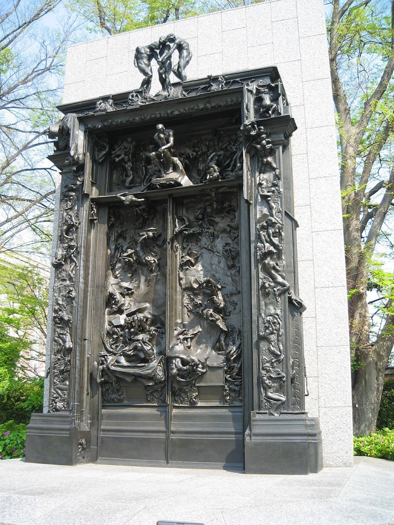 A mais famosa escultura de Rodin, O Pensador, integra o Portal do Inferno. Inicialmente chamada de O Poeta, ela aparece em tamanho reduzido, observando do alto os atormentados do Inferno: os personagens do poema de Dante.