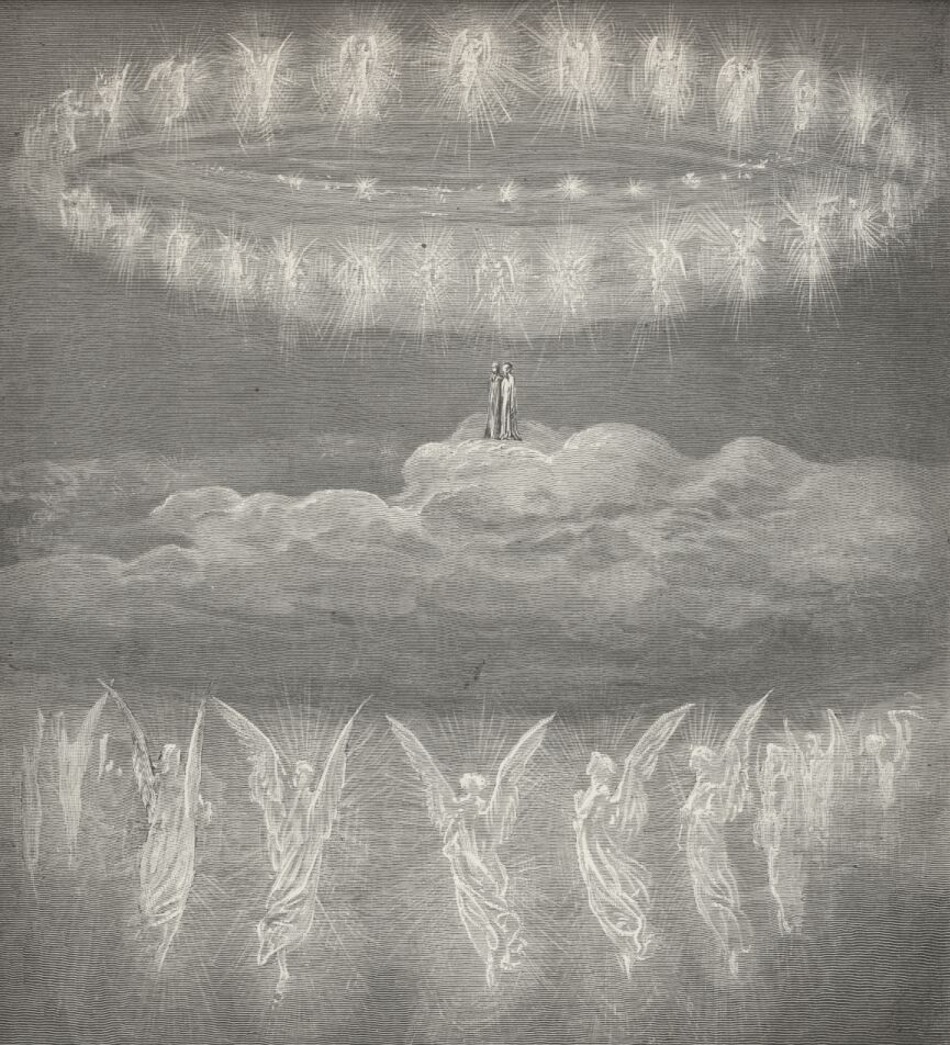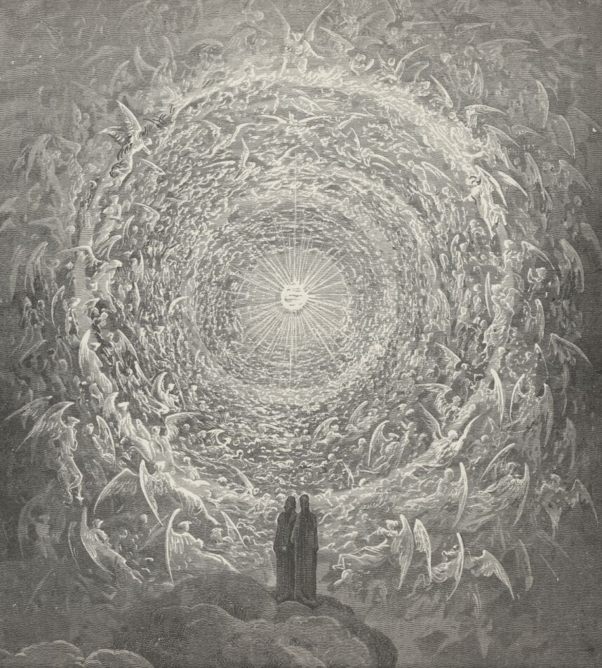 No céu cristalino, Dante adquire um novo sentido, a fim de compreender o mundo espiritual. Há nove círculos angélicos, concêntricos, que giram em volta de Deus. Lá, ao receber a visão da Rosa Mística, o poeta se separa de Beatrice e tem a oportunidade de sentir o amor que emana diretamente de Deus, algo que Dante define com o verso final da Divina Comédia: “l’amor che move il sole e l’altre stelle” (O amor que move o Sol e as outras estrelas).