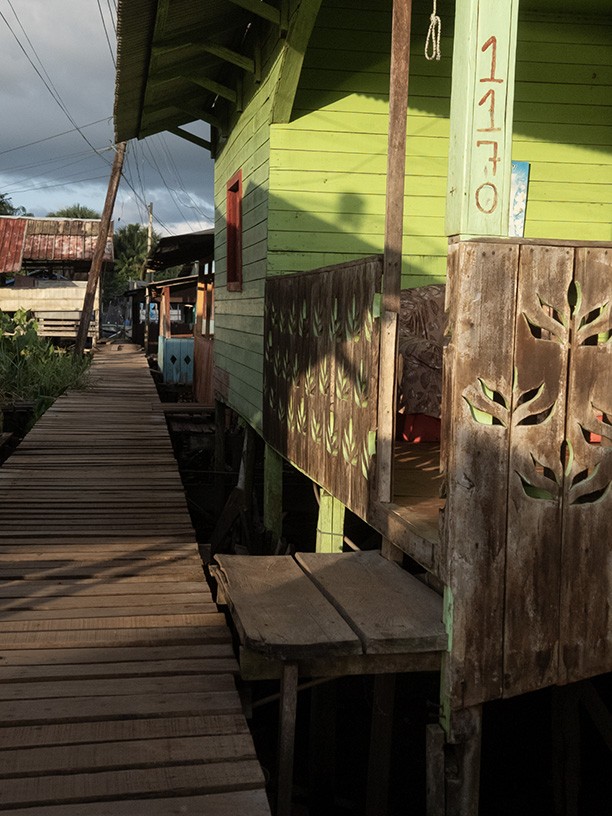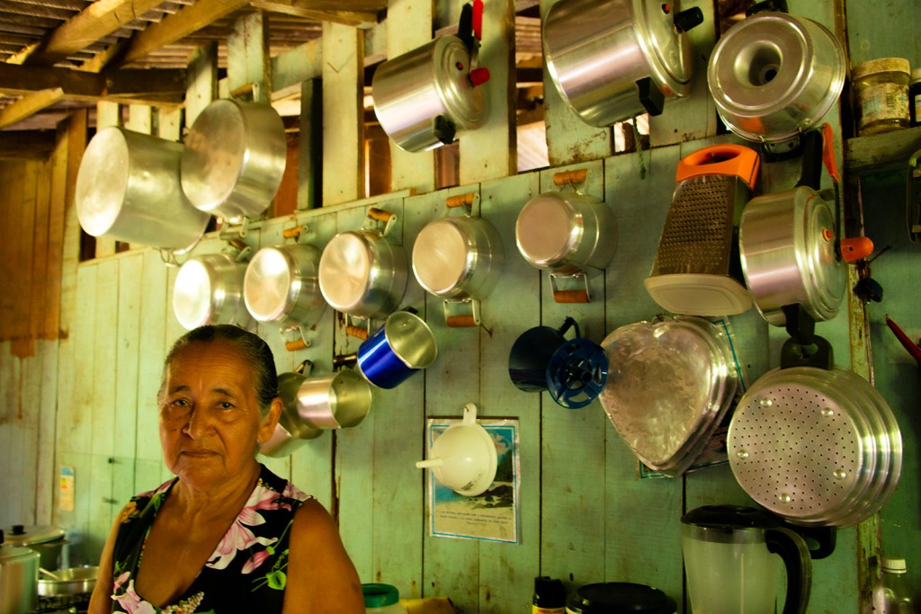 A casa de Jodoval e Leonice, típica habitação ribeirinha, se destaca pela limpeza. Um tapete de retalhos à porta permite manter reluzente o chão encerado; as panelas cuidadosamente arrumadas brilham na parede da cozinha simples. Não há pia. Apenas o tradicional jirau amazônico – uma extensão da cozinha feita de madeira exclusivamente para lavar as louças e cortar alimentos. Versão cabocla das modernas bancadas, mas sem água encanada ou esgoto. A água escorre entre as tábuas até o chão.