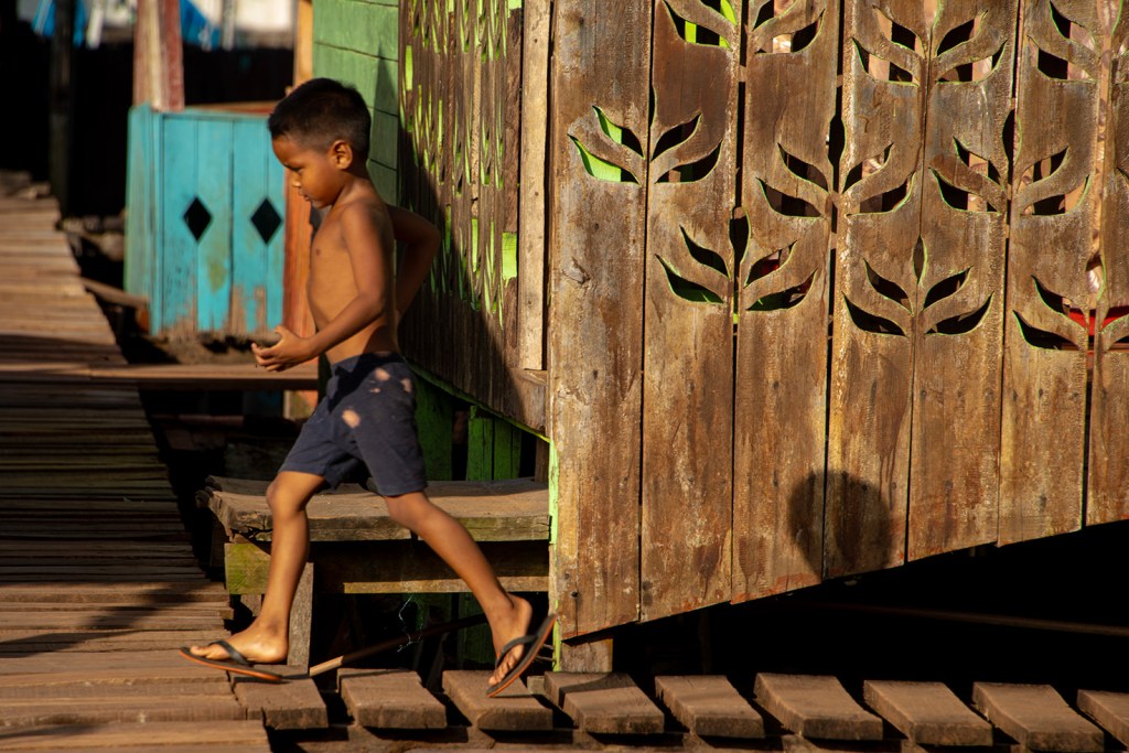 O sol vai se pondo no rio Oiapoque, todos estão em silêncio. O neto de Marinaldo, de 4 anos, caminha pela pontes de madeira e se detém olhando a lama nas margens. O fotógrafo Manoel Neto capta a silhueta da terceira geração de exilados do Taperebá.