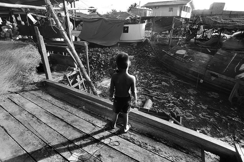 O sol vai se pondo no rio Oiapoque, todos estão em silêncio. O neto de Marinaldo, de 4 anos, caminha pela pontes de madeira e se detém olhando a lama nas margens. O fotógrafo Manoel Neto capta a silhueta da terceira geração de exilados do Taperebá.